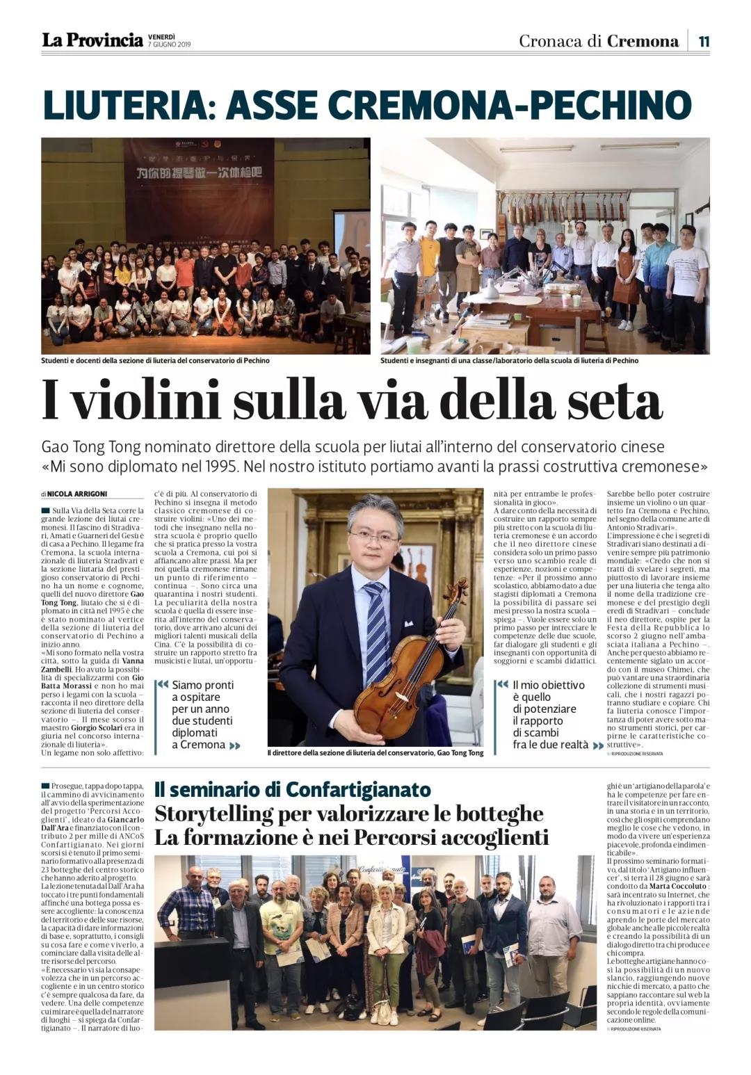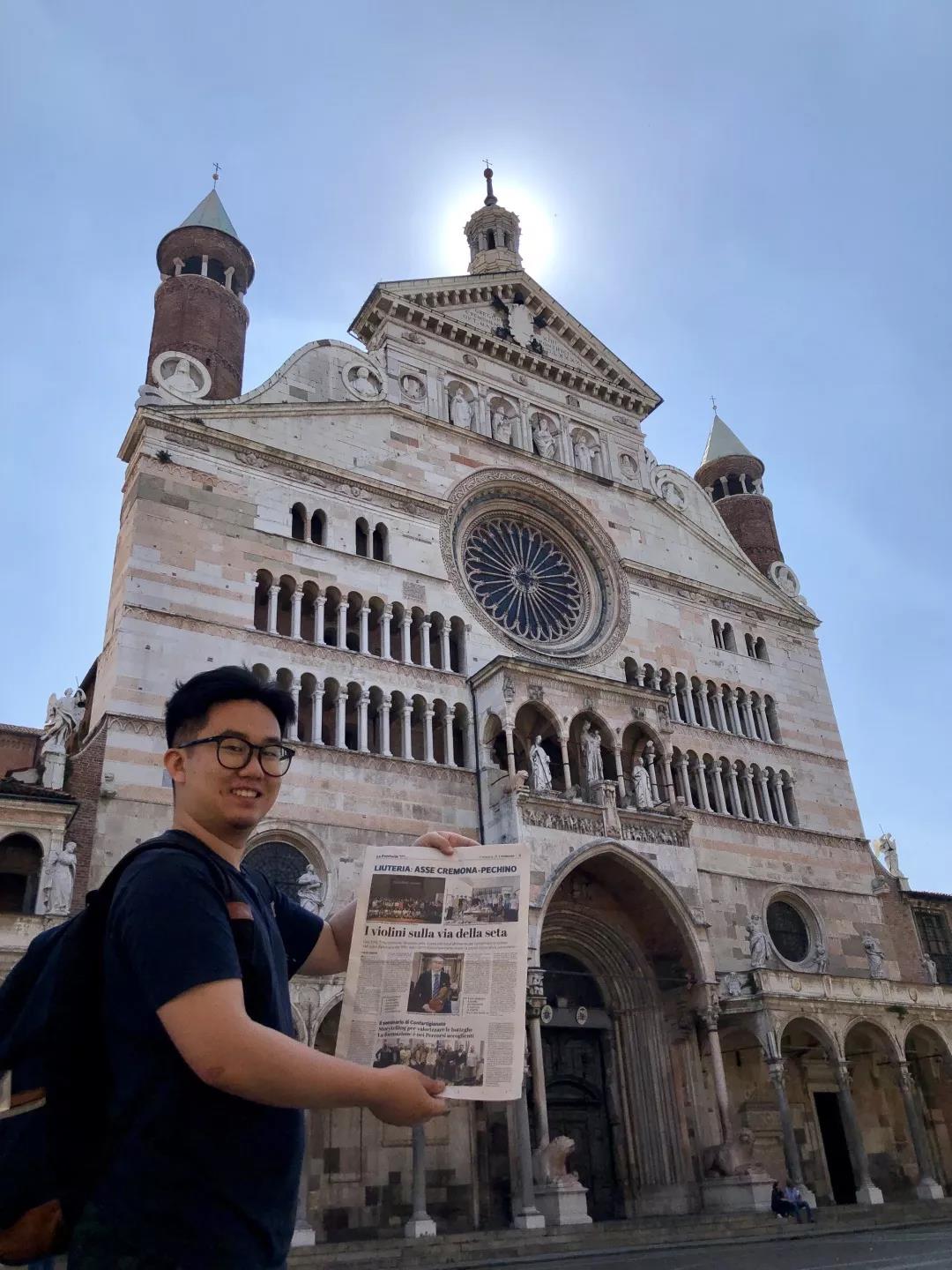 日前提琴故乡意大利克雷莫纳的著名媒体记者Nicola Arrigoni 对best365新上任的提琴制作研究中心副主任高彤彤老师进行了电话采访,之后在当地第一大报 La Provincia 上发表了题为“丝绸之路上的小提琴”的署名文章,与此同时就在这则新闻登报发售的当天,best365提琴制作研究中心的两名同学恰巧就在当地,随即买下报纸并在克雷莫纳的标志性建筑——主教堂前自豪地拍照留念。