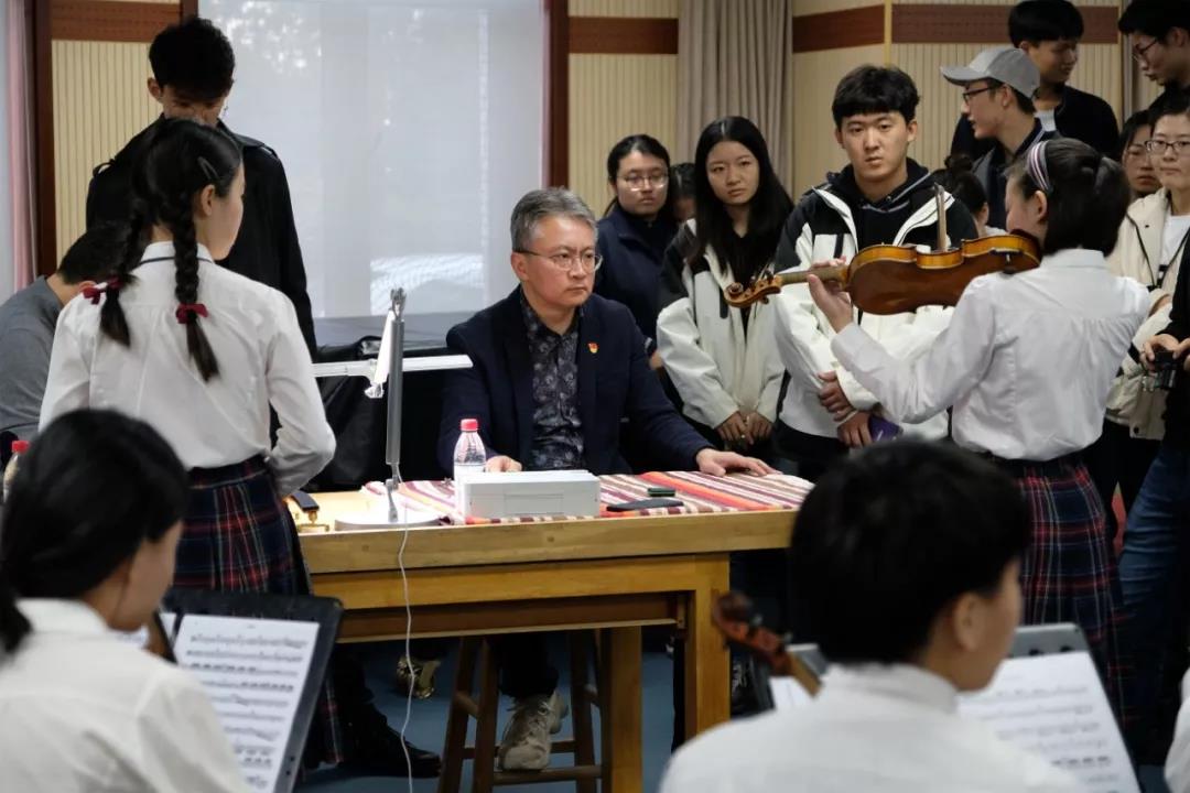 移步附中圆弧厅,附中少交的同学们用未经调试的乐器演奏了维瓦尔第的《秋》。琴声美妙,却也偶见瑕疵。 高彤彤老师和逯翔老师坐在专用工作台前,俨然“提琴医生”,开始为同学们做提琴的现场诊断与调整。 老师们一边耐心讲解一边做调整, 同学们也在指导下多次试奏来找到他们心目中想要的声音。