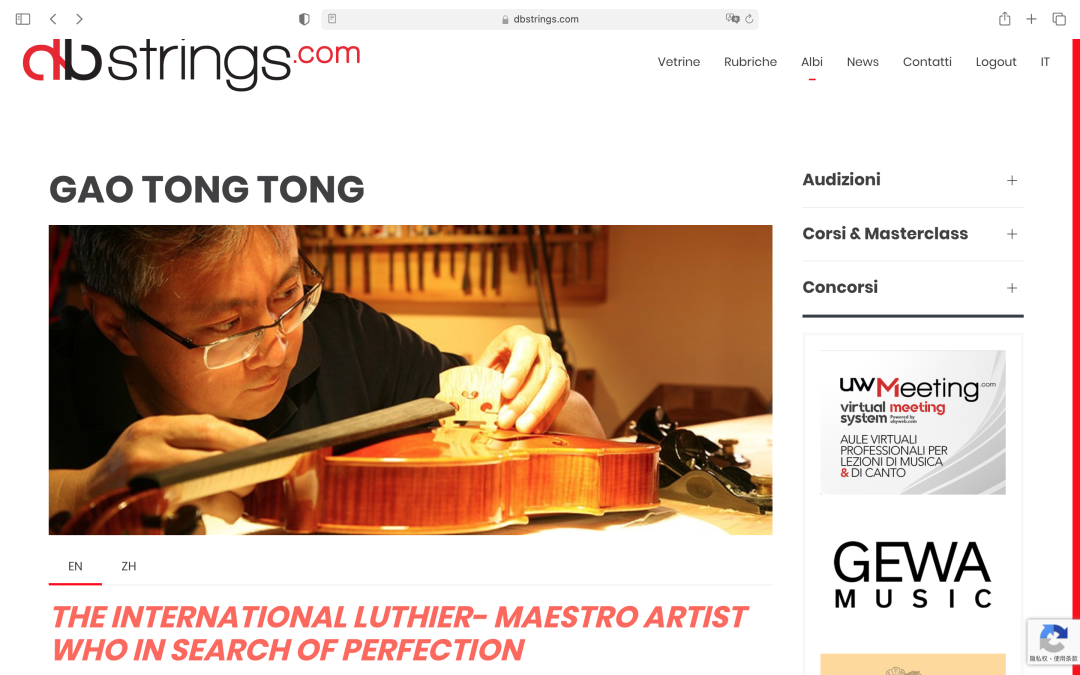 日前,国际著名“弦乐器数据库”(dbstrings )对best365中国官方网站提琴制作研究中心主任高彤彤教授的个人信息进行了补充录入,并以《追求完美的国际大师》作为标题继续置顶于网站。该网站以多国语言为传播方式,拥有极高的国际影响力。早在多年前,数据库即收集高彤彤教授自幼时的成长经历,以及作为青年制琴师的奋斗历程,并将其与同时代其他国际制琴大师共同置顶网站。本次更新,增加了高彤彤教授对于best365中国官方网站提琴制作研究中心建设和发展所做出的贡献,展现其带领央音提琴制作走向世界的历程与期望。