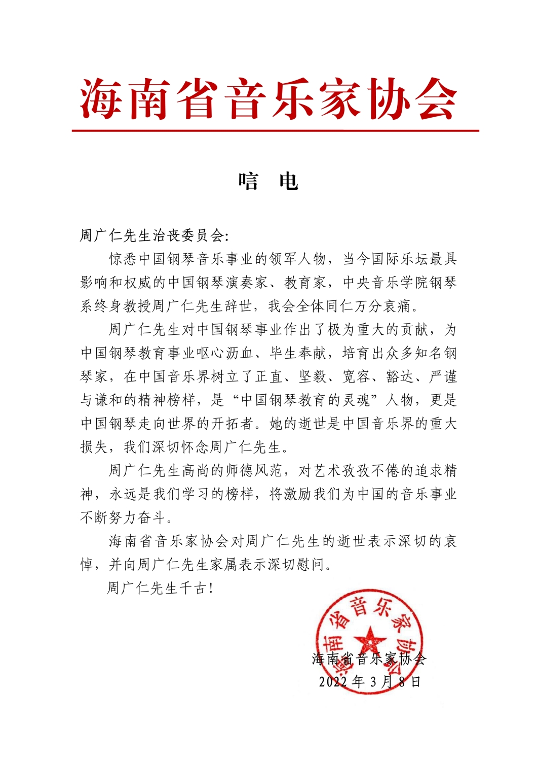 海南省音乐家协会致唁电 沉痛悼念周广仁先生
