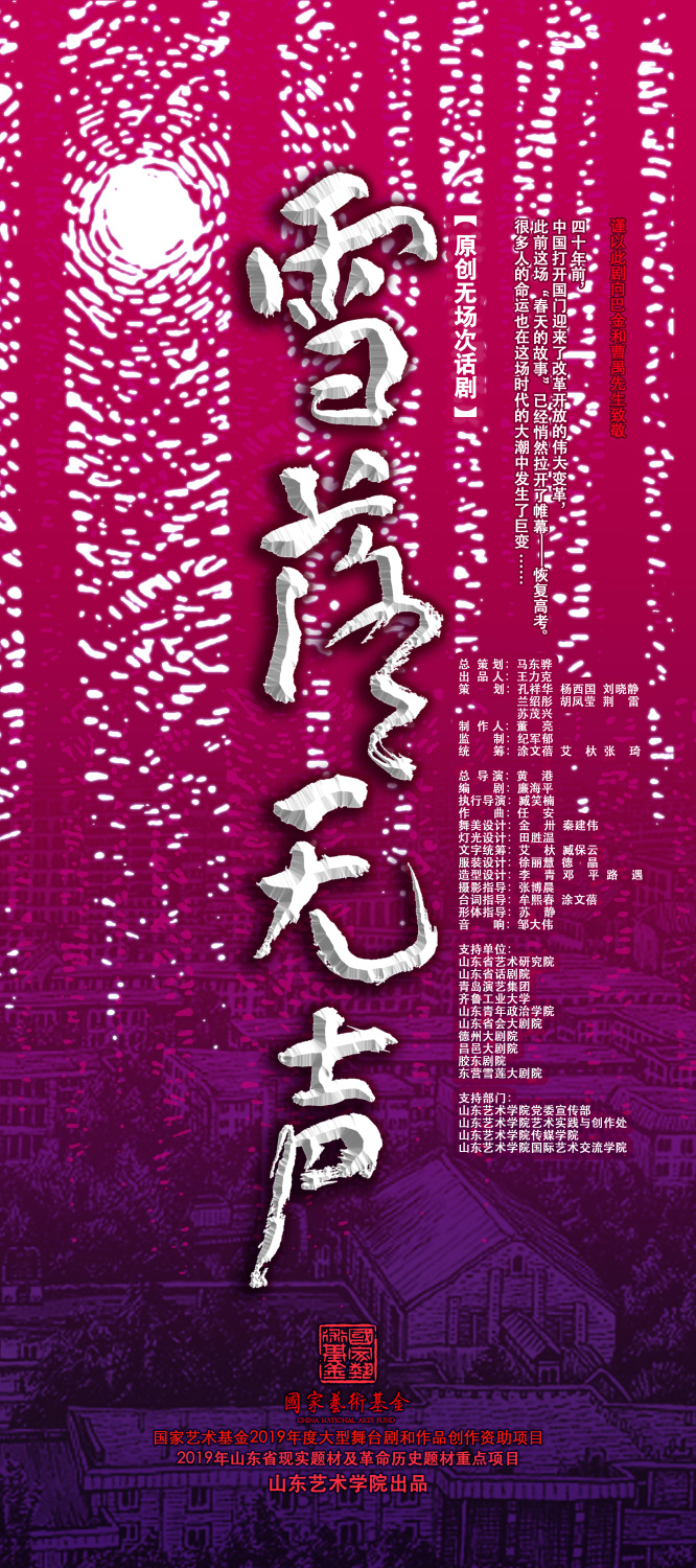 无场次原创话剧《雪落无声》是山东艺术学院戏剧学院创作的一部现实题材作品,它以我国改革开放40余年来,某艺术院校的艺术教育变迁和几代艺术人的价值追求为创作背景,讲述了一群大四表演专业的学生和他们即将退休的老师张建博的人生历程。