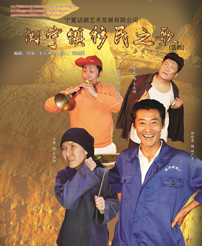 话剧《闽宁镇移民之歌》是由“国家有突出贡献话剧艺术家”王志洪担任编剧、导演。该剧自2012年首演以来,先后入选、获得“2017年国家舞台艺术精品创作扶持工程十大重点扶持剧目”;“2018年全国舞台艺术优秀剧目展演开幕式开幕剧”;“全国优秀现实题材舞台艺术作品展演示范剧目”等,该剧还成功入选文化和旅游部2021年“庆祝建党100周年舞台艺术精品创作工程”“百年百部”传统精品复排计划重点扶持作品。