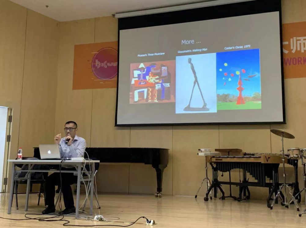 赵菁文教授的音乐创作往往伴随着大量的实验,她提到自己会与专业团队去苗栗的隧道中,通过不同的手段,寻找新的发声方式,捕捉不同声音的特质,这是教授对音色作出的一种审美价值判断,她还为各种策展活动写作音乐,身体力行的实现着音乐的社会价值。黄若教授也会引用不同的媒介,来进行音乐的创作。所有的这一切,都是他们在实现自我“审美维度”时借用的方式。黄若教授在讲座开场时讲述了非常多的现代音乐类型,并且通过同时期的绘画流派进行了一一对照讲解。他是一位十分注重音乐人文内涵的作曲家,他说,“当代社会中世界文化的频繁交流,以及作曲家在世界各地的生活体验,造就了艺术表现形式的多元化。作曲家不再是地域性的,而是一个综合的文化表现形态,而自己正是其中一员”。
