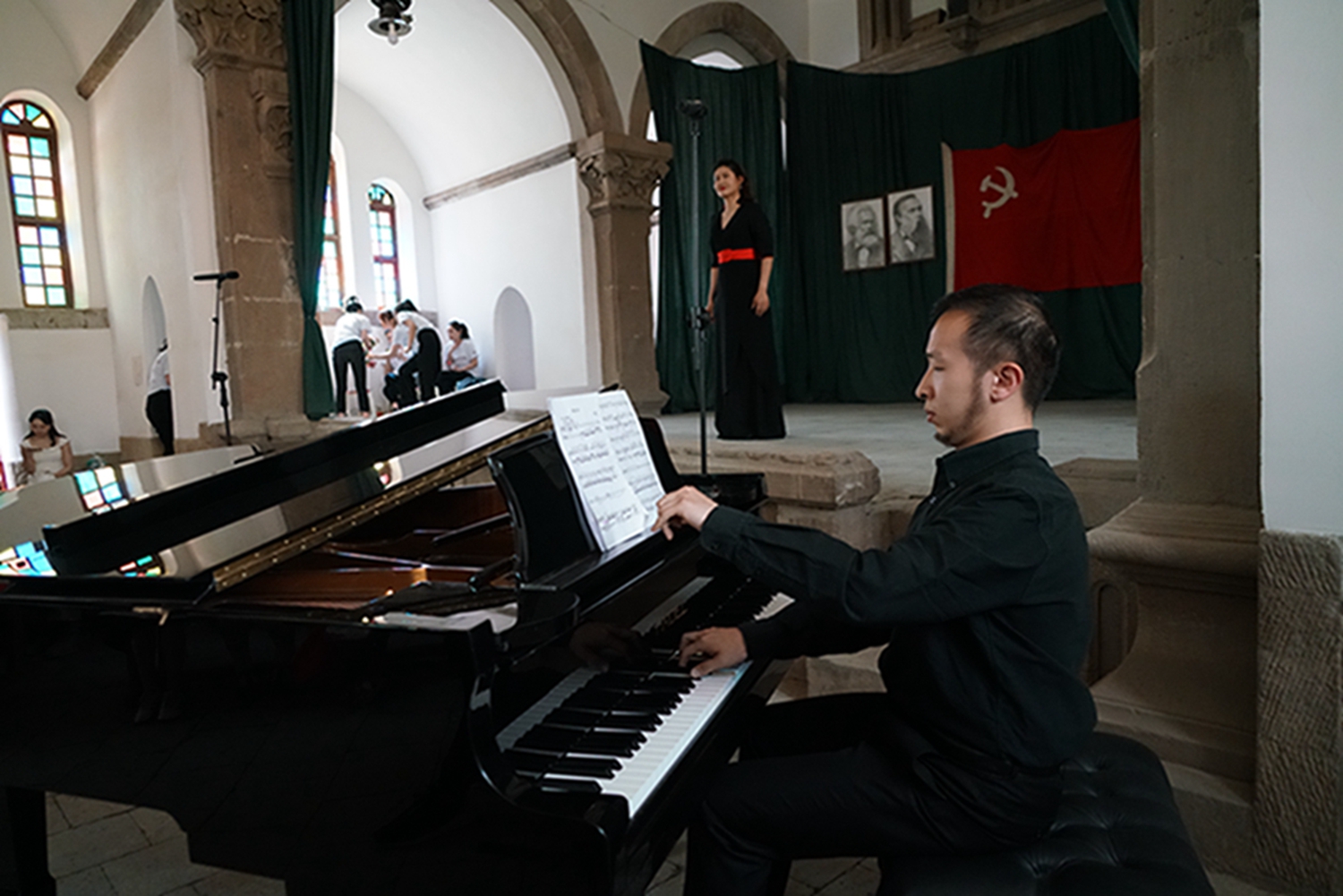 尤其值得一提的是,音乐会是在鲁艺旧址的大教堂举行,这是这座教堂时隔74年(延安鲁艺1945年迁往东北)以来的首次演出。这栋建筑历经风雨战火,墙体剥蚀,铺地灰色的青砖坑坑洼洼变成黄土色,然而当嘹亮的歌声灌满整个厅堂、在红色的横幅中激荡,庄严神圣的革命情怀油然而生,让人立时热泪盈眶。