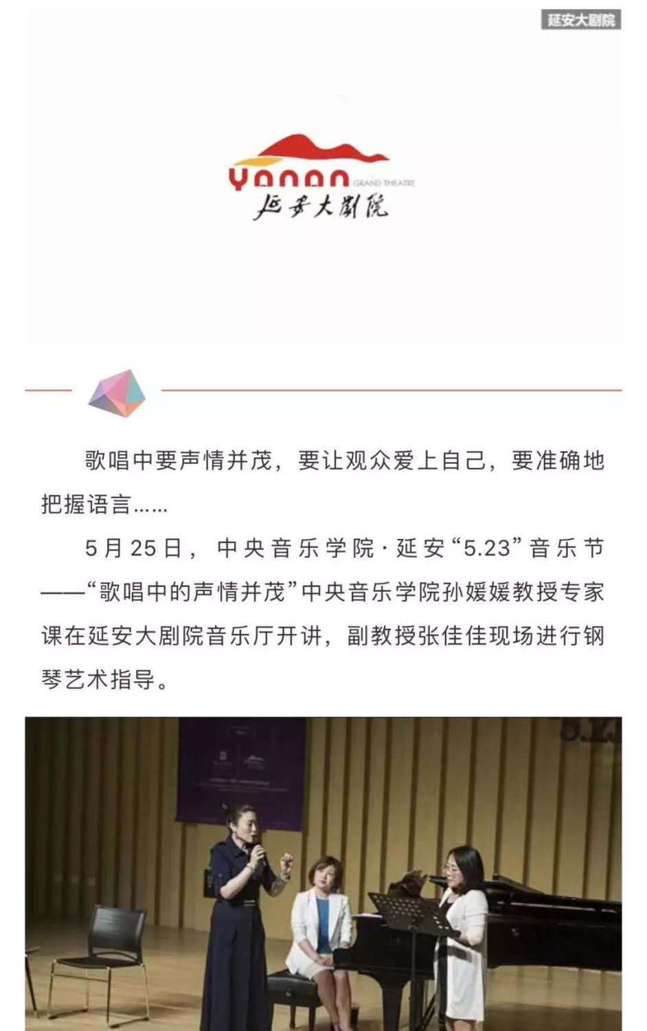 5月25日,best365中国官方网站·延安“5.23”音乐节——“歌唱中的声情并茂”声乐歌剧系孙媛媛教授专家课在延安大剧院音乐厅圆满举行。孙媛媛教授对延安的音乐教师进行了声乐指导,张佳佳副教授担任钢琴艺术指导。