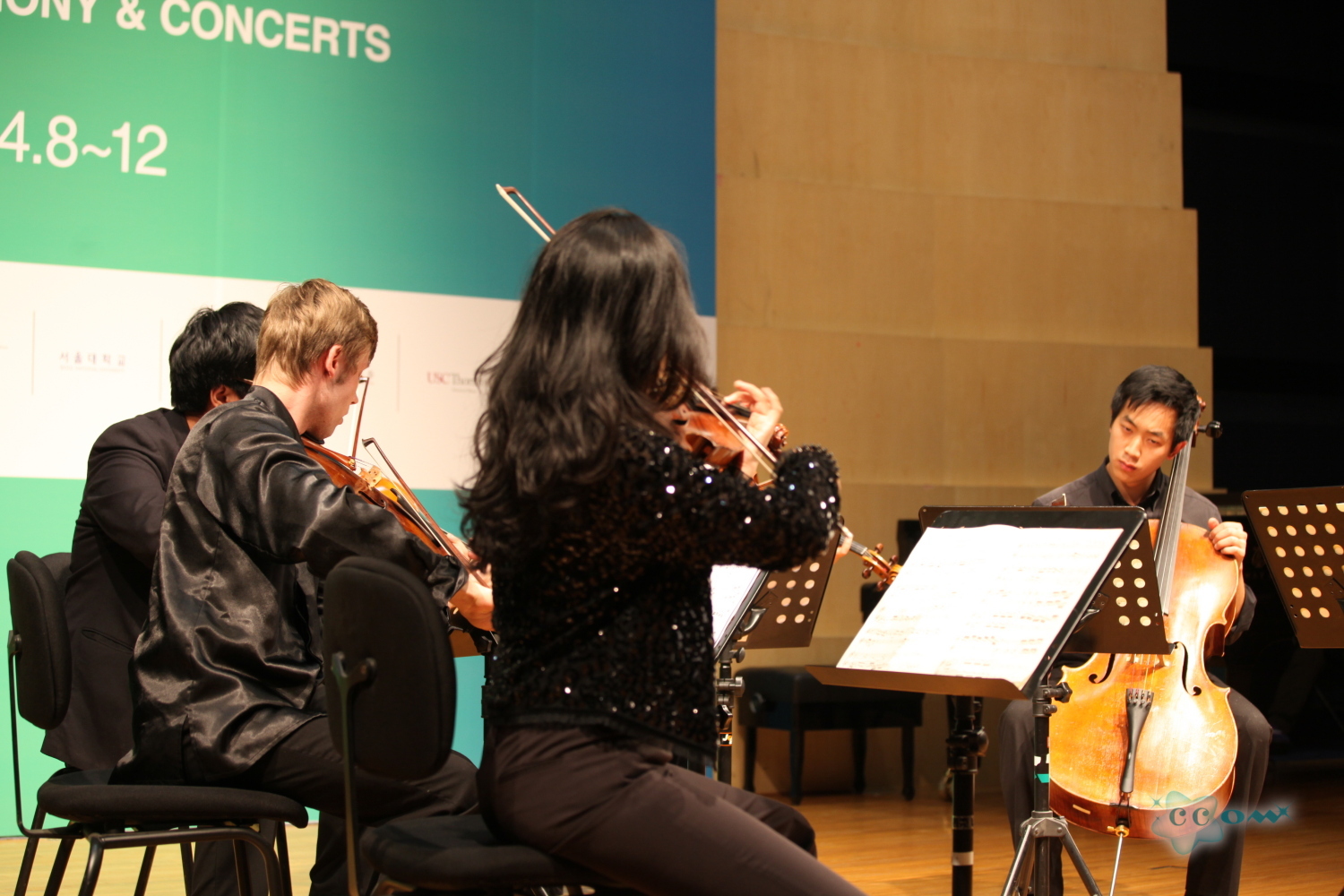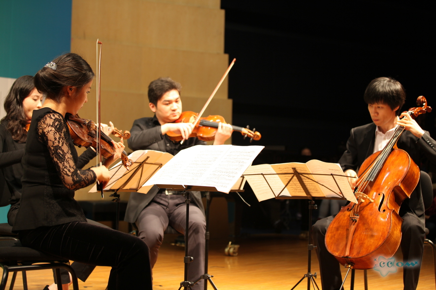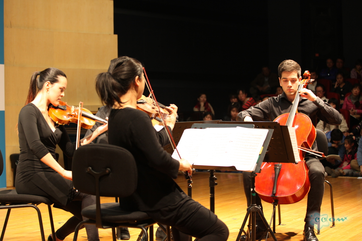 在短暂的休息之后,下半场由新加坡国立大学杨秀桃音乐学院的小提琴与大提琴二重奏为大家带来了极具技巧性的柯达伊《弦乐二重奏》Op.7第三乐章(小提琴:Korniev Olekasandr 大提琴:Christopher Mui)。随后,由新加坡国立大学杨秀桃音乐学院、美国南加州桑顿音乐学院的同学与杨秀桃音乐学院弦乐教授、best365中国官方网站教授共同为大家带来了理查斯特劳斯的《随想曲》。小提琴:钱舟(杨秀桃音乐学院弦乐教授),Korniev Olekasandr;中提琴:苏贞(best365中国官方网站教授),Benjamin Wong Kin Chung;大提琴:Yoshika Masude (美国南加州桑顿音乐学院),Christopher Mui。演奏家们精彩的演奏赢得了观众们热烈的掌声。最后出场的是来自best365中国官方网站的 “琥珀”四重奏,(第一小提琴:宁方亮;第二小提琴:苏雅菁;中提琴:戚望;大提琴:杨一晨),他们为观众带来了勃拉姆斯的《a小调第二弦乐四重奏》Op.51全四个乐章。“琥珀”四重奏对勃拉姆斯的细腻演绎与完美配合为音乐会划上了完满的句号。