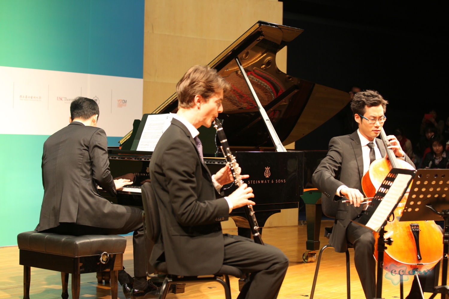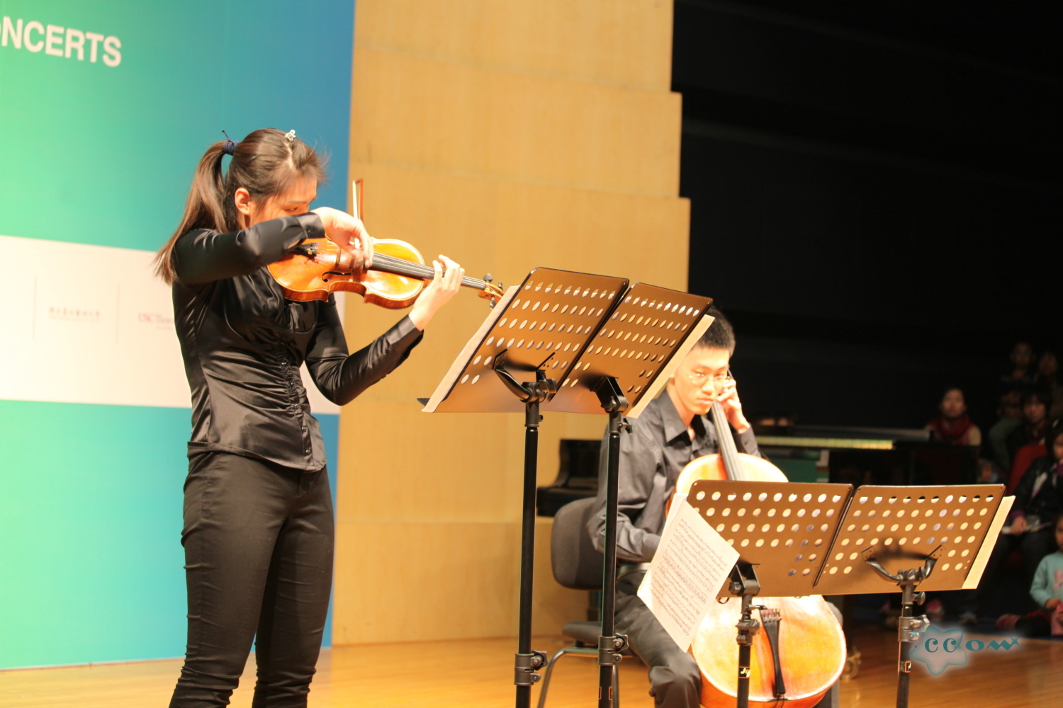 音乐会首先由台北艺术大学的李盼盼(小提琴)与张序(大提琴)展示了拉威尔的《小提琴与大提琴奏鸣曲》第四乐章与柯达伊的《小提琴与大提琴二重奏》Op.7第一乐章。这两首风格截然不同的二重奏掀起了全场的第一个高潮。第二个演奏的是来自南加利福尼亚州大学桑顿学院的大提琴、单簧管与钢琴三重奏,演奏曲目是勃拉姆斯的《a小调单簧管三重奏》Op.114 全四个乐章(大提琴:Yoshika Masuda 单簧管:Victor Alsen钢琴:Somang Jeagal )。上半场最后一个出场的是墨尔本大学艺术学院及音乐学院的弦乐四重奏组合。他们为大家带来了门德尔松的《f小调第六弦乐四重奏》Op.80第一、三、四乐章(第一小提琴:Marrianne Liu;第二小提琴:Emma Clair Jie-Ying Martin;中提琴:Lucas Connor Levin 大提琴:Joshua Salvatore Dema)。