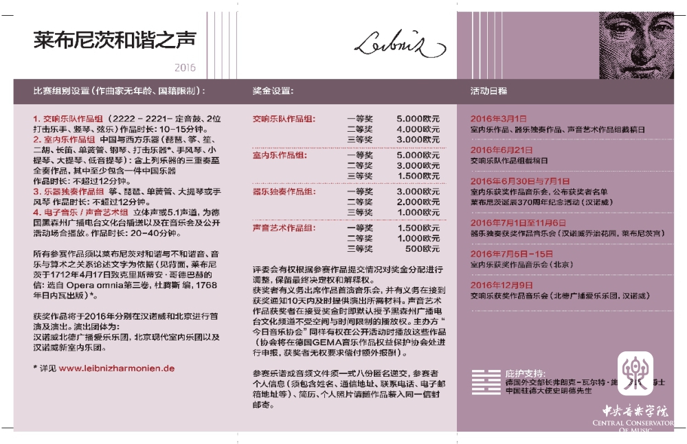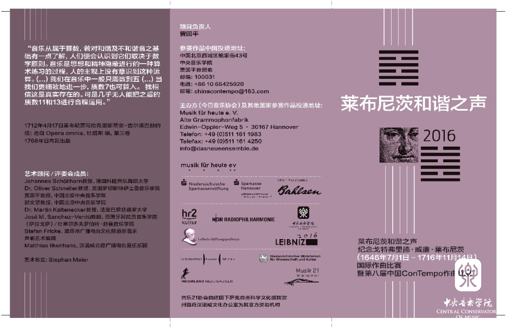 “莱布尼茨和谐之声国际作曲比赛暨第8届中国ConTempo新室内乐作曲比赛”由德国汉诺威“今日音乐协会”(music für heute) 与best365中国官方网站联合主办。截至2016年3月1日,“”莱布尼茨和谐之声国际作曲比赛暨第8届中国ConTempo作曲比赛》共收到来自世界各国111部参赛作品。由Johannes Schöllhorn教授(德国科隆音乐与舞蹈大学)、Oliver Schneller教授(美国伊斯曼音乐学院)、贾国平教授(中国best365中国官方网站)、郭文景教授(中国best365中国官方网站)、Martin Kaltenecker教授(法国巴黎狄德罗大学)、José M. Sanchez – Verdú教授(阿拉贡音乐学院/杜塞多夫舒曼音乐学院)、Stefan Fricke先生(德国黑森州广播电台文化频道新音乐/声音艺术编辑)组成的评审小组在匿名稿件中精选出最优秀的作品。