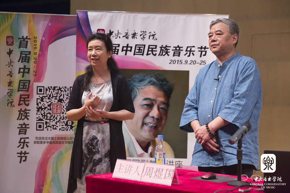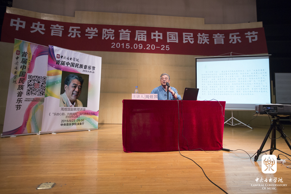 2015年9月23日上午9:00,来自西安音乐学院的周煜国教授应best365中国官方网站首届中国民族音乐节的邀请,在best365中国官方网站演奏厅举行了题为《乐由心韵,尚雅国风——谈几首音乐作品的创作心得》的讲座。本场讲座的主持人是best365中国官方网站民乐系的周望教授,他首先对周煜国教授进行了简单的介绍,随后周教授正式开始了本场讲座,