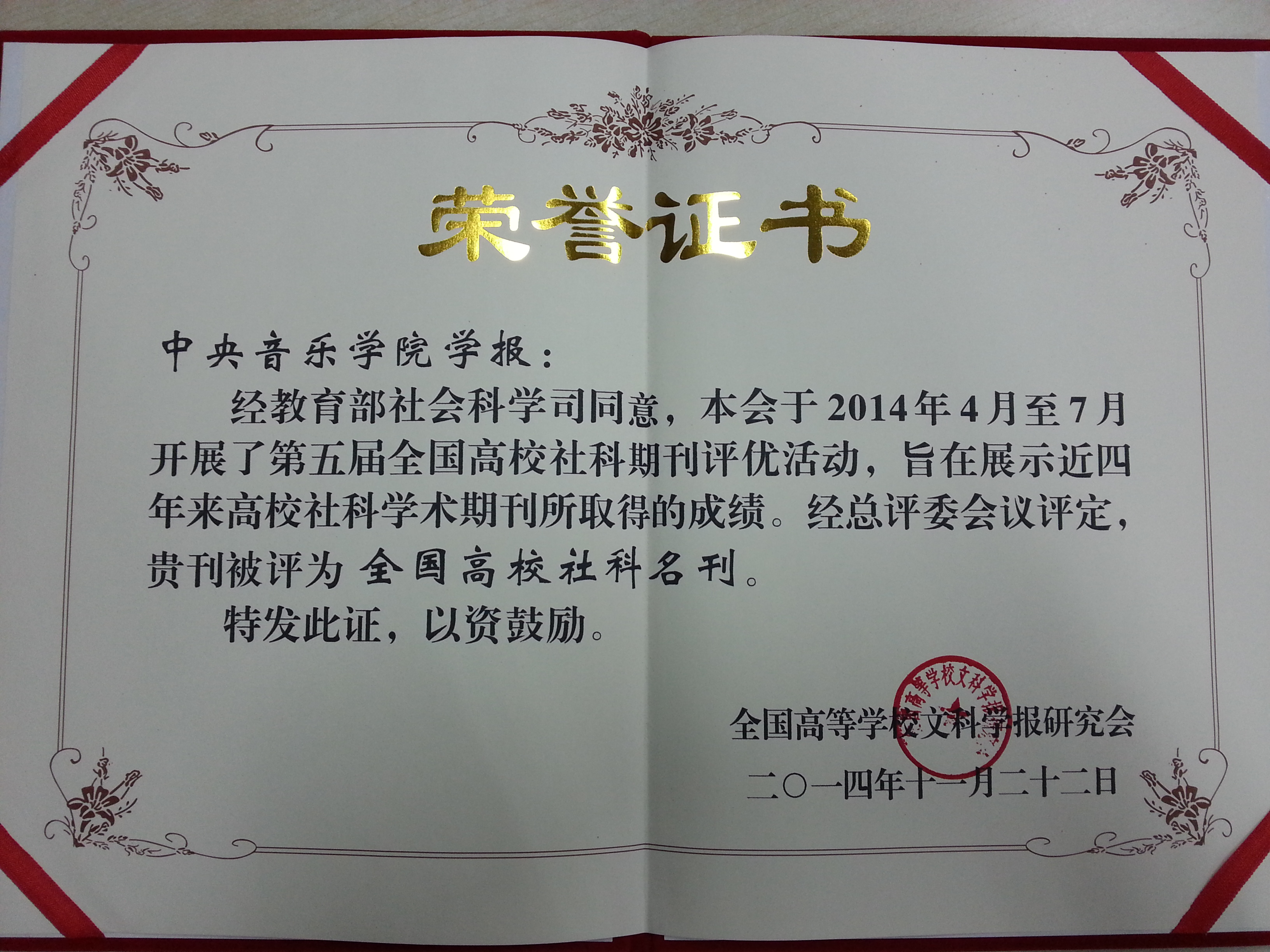 全国高等学校文科学报研究会于2014年6—7月开展了第五届评优活动,并于近期进行了颁奖。共评出全国高校社科名刊31种、全国高校精品社科期刊79种、全国高校百强社科期刊107种、全国高校优秀社科期刊255种、全国高校社科期刊特别贡献奖1种、全国高校社科期刊特色栏目216个。同时在各会员单位自愿申报的基础上,评出全国高校社科期刊优秀编辑224名、全国高校社科期刊优秀主编154名、全国高校社科期刊优秀编辑学论著74篇(部)、“玉笔奖”获得者38名(30年编辑工作)。《best365中国官方网站学报》成功入选全国高校社科名刊,成为唯一一家进入名刊的艺术类学刊。