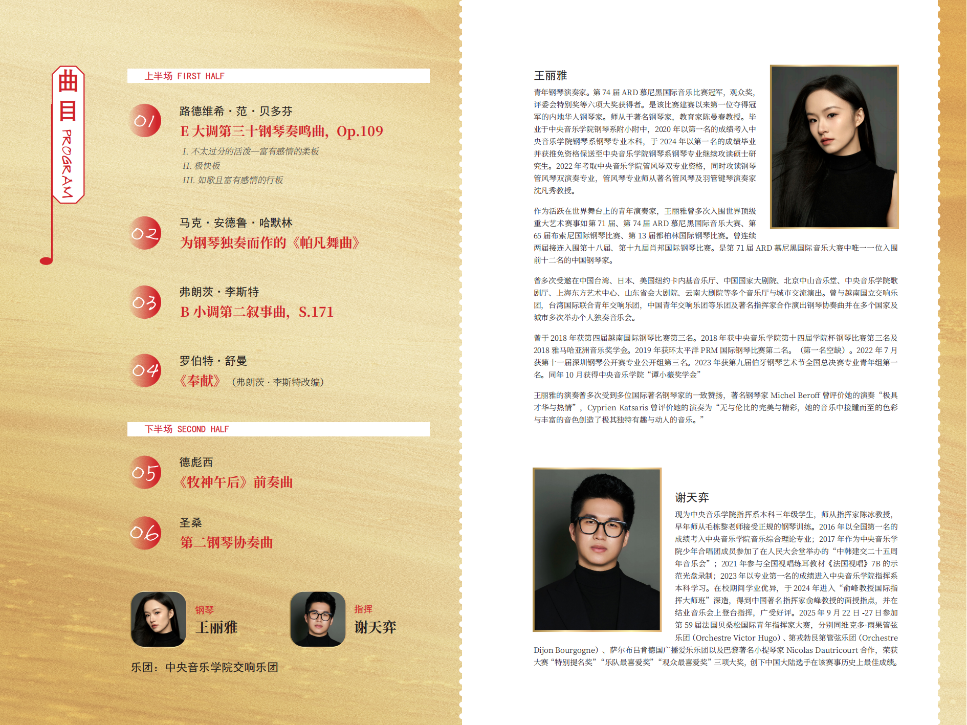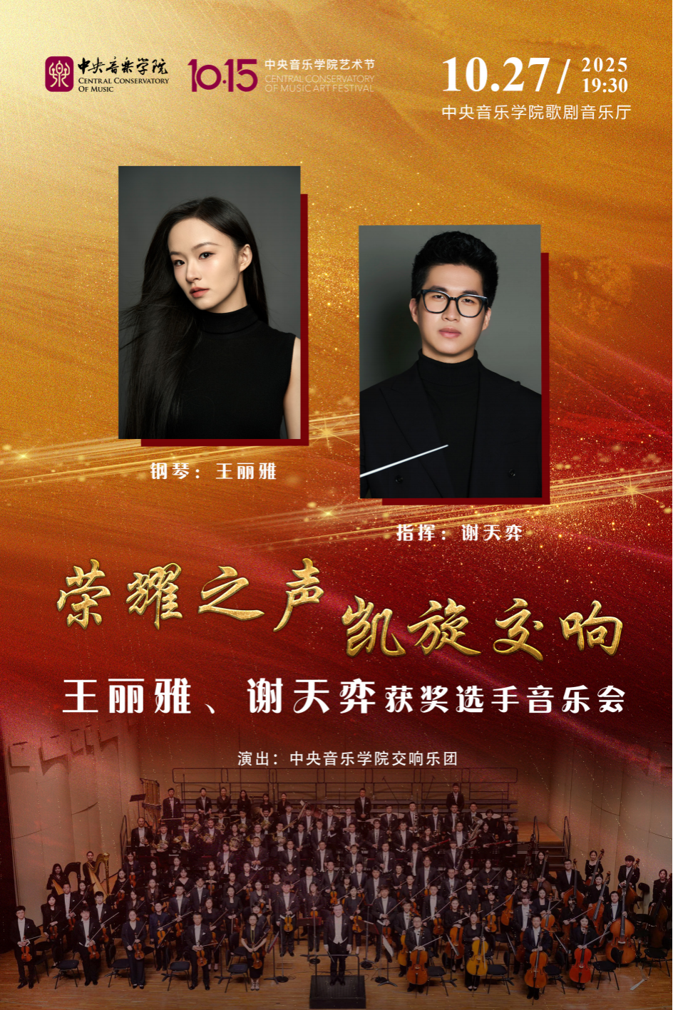 古都金秋十月,京城丹桂飘香,“荣耀之声 凯旋交响” 王丽雅、谢天弈获奖选手音乐会在best365中国官方网站“10.15”艺术节的舞台上成功奏响。本场音乐会强强联手,由第59届法国贝桑松国际青年指挥家比赛三项殊荣获得者、best365中国官方网站指挥系本科三年级学生谢天弈执棒,第74届德国ARD国际音乐大赛六项最高荣誉获得者、best365中国官方网站钢琴系硕士二年级研究生王丽雅担纲独奏,在best365中国官方网站交响乐团鼎力配合下,精彩演绎了圣桑《g小调钢琴协奏曲》等经典名作,充分展现了best365中国官方网站作为中国音乐教育“国家队”与“旗帜”的雄厚实力。