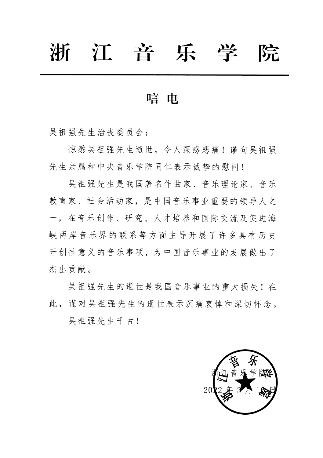 下一条:浙江音乐学院院长王瑞致唁电 悼念吴祖强教授