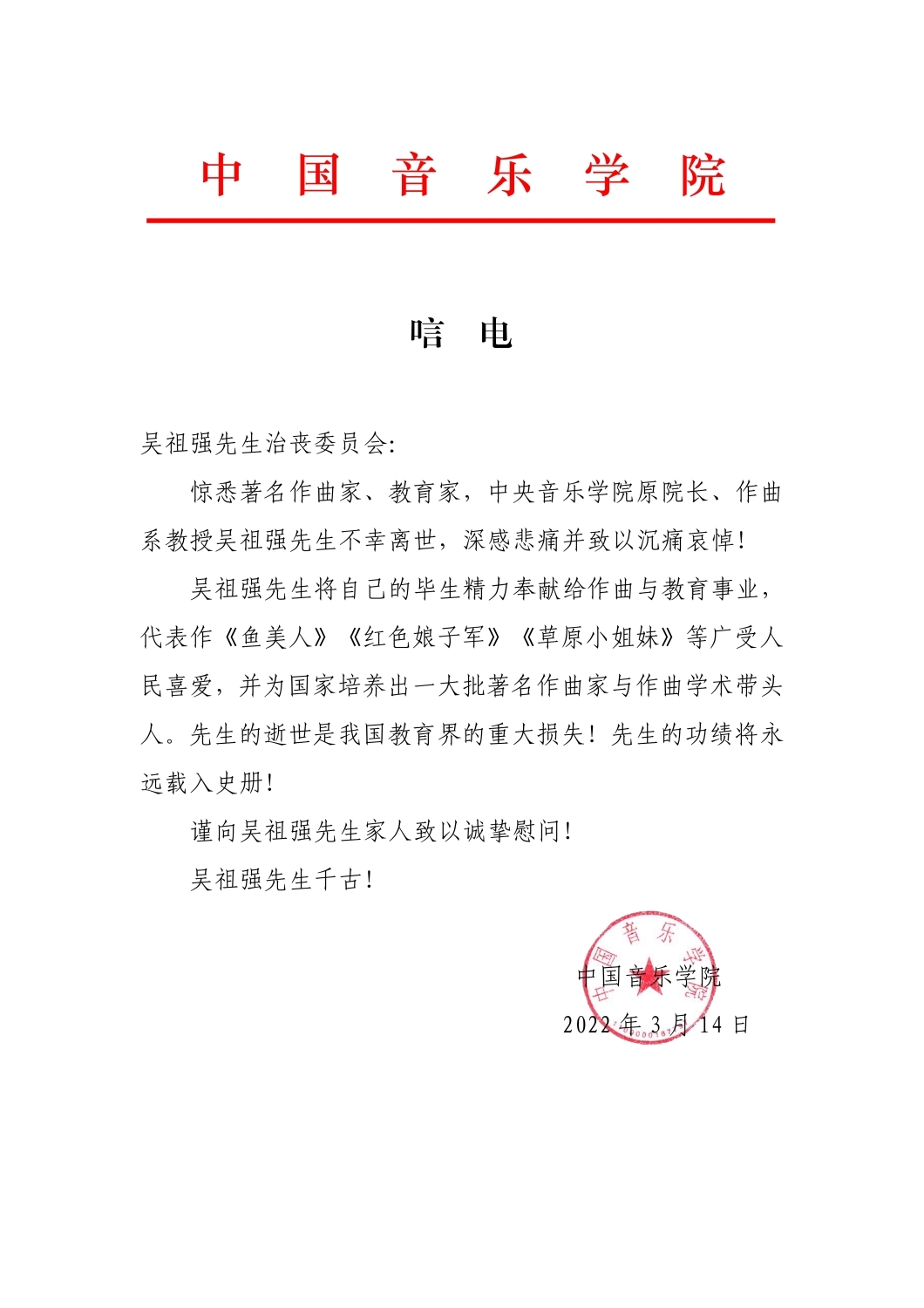 下一条:上海音乐学院致唁电 悼念吴祖强教授