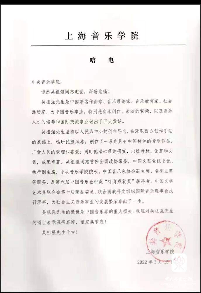 上一条:中国音乐学院致唁电 悼念吴祖强教授