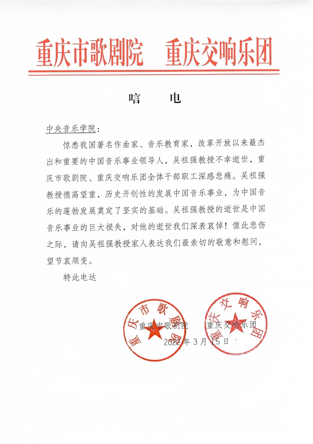 重庆市歌剧院 重庆交响乐团致唁电 悼念吴祖强教授