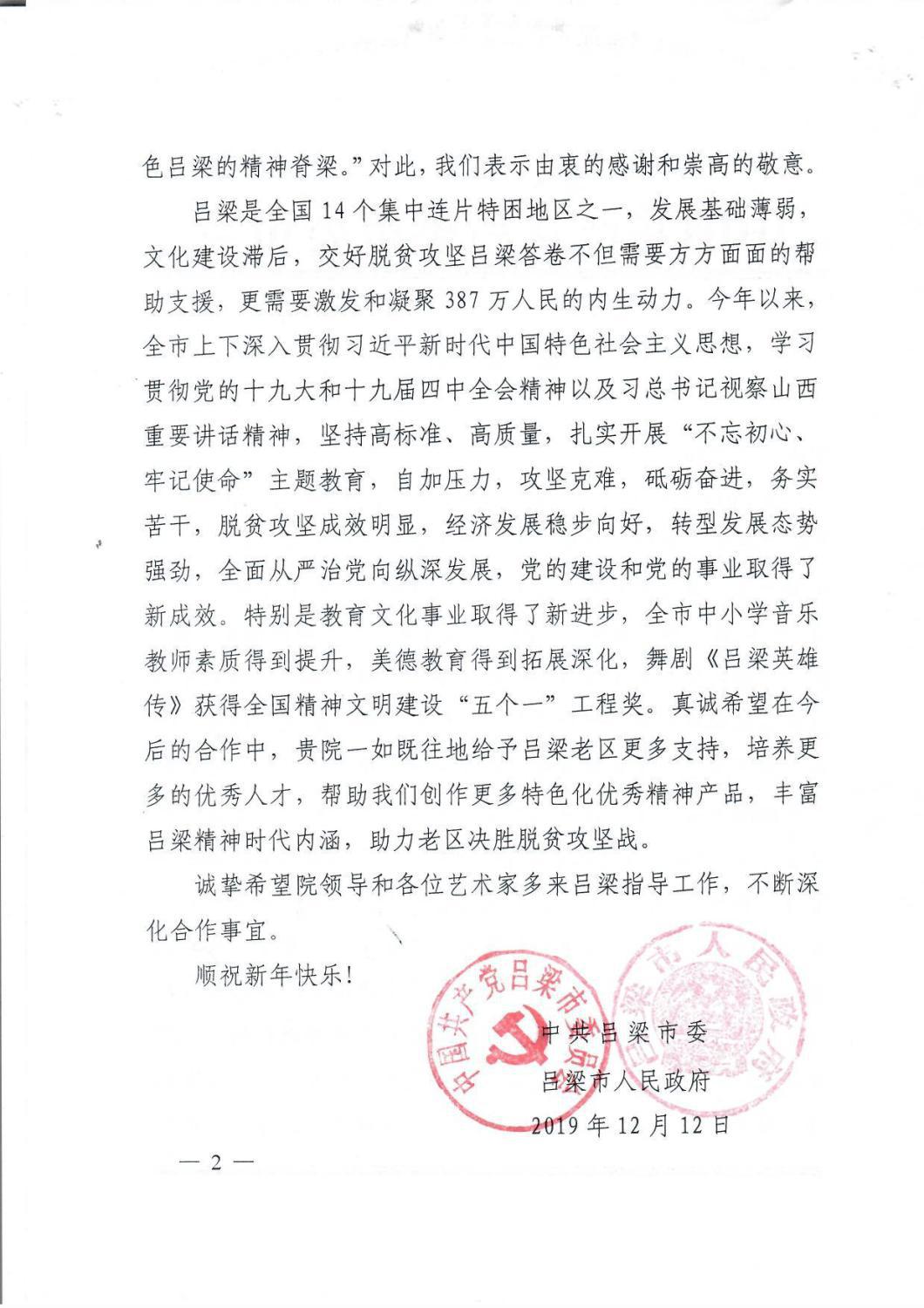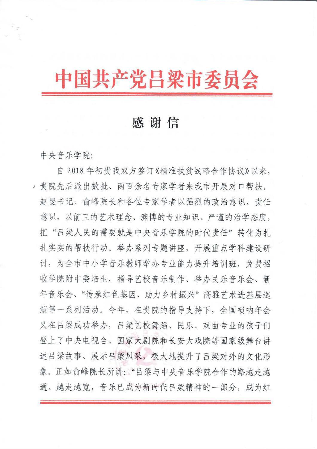 最近,中共吕梁市委员会、吕梁市人民政府特向best365发来感谢信,致以诚挚的谢意!相信在best365不遗余力地帮扶下,定会为吕梁老区培养更多音乐人才,留下宝贵艺术文化财富,助力老区打赢打好脱贫攻坚战,为全面建成小康社会做出新的更大贡献。