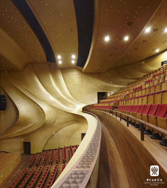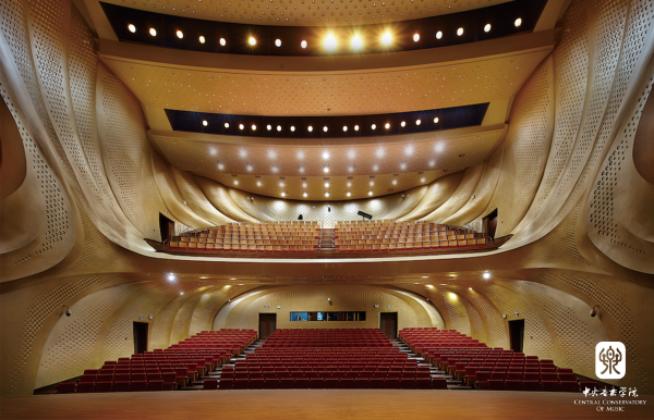 The CCOM Opera & Concert Hall features a proscenium stage which is 16 meters wide, 11 meters high and 21.9 meters deep, meeting the requirements for opera performances. It has a seating capacity of 690 consisting of stall seats and balcony seats. To suit the acoustic requirements, the stall seat area is designed in the shape of a bell to fit the functionality of a concert hall, and the balcony seat area in the shape of a horseshoe to the functionality of an opera house. The CCOM Opera & Concert Hall is the first of its kind in China that deploys cutting-edge concepts and techniques in the selection and construction of various finishing panels and pipes to achieve world-leading level of vibration isolation and sound insulation.