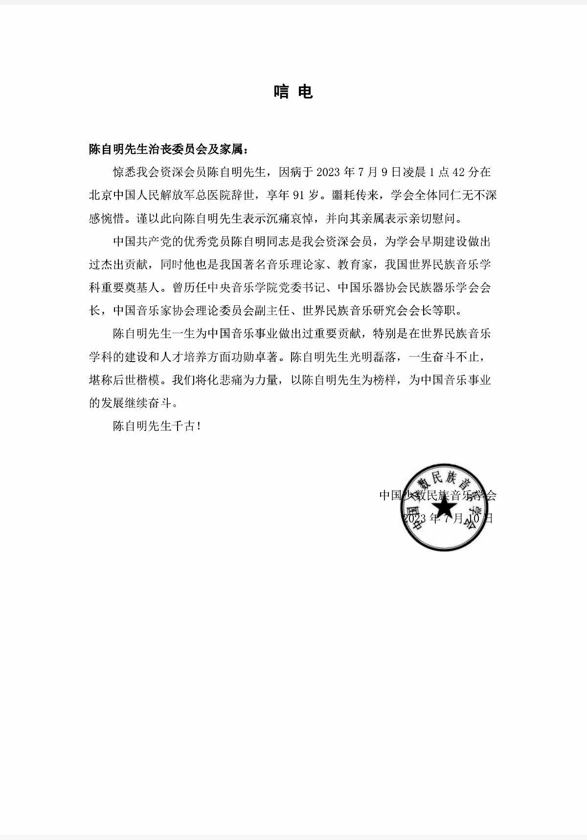 中国音乐家协会世界民族音乐学会致唁电 沉痛哀悼陈自明教授